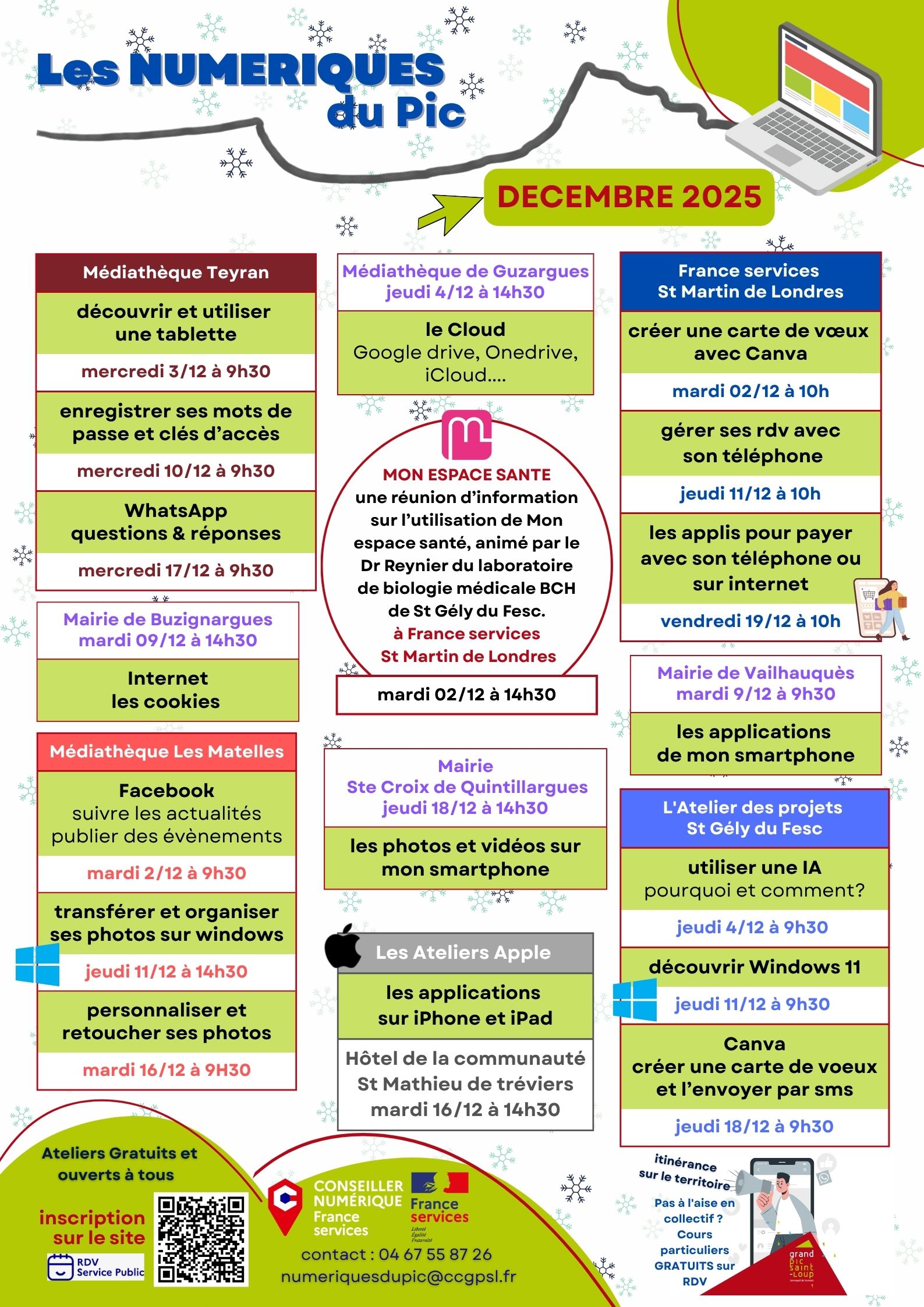 Voici le programme de nos ateliers numériques pour le mois de Décembre 2025.