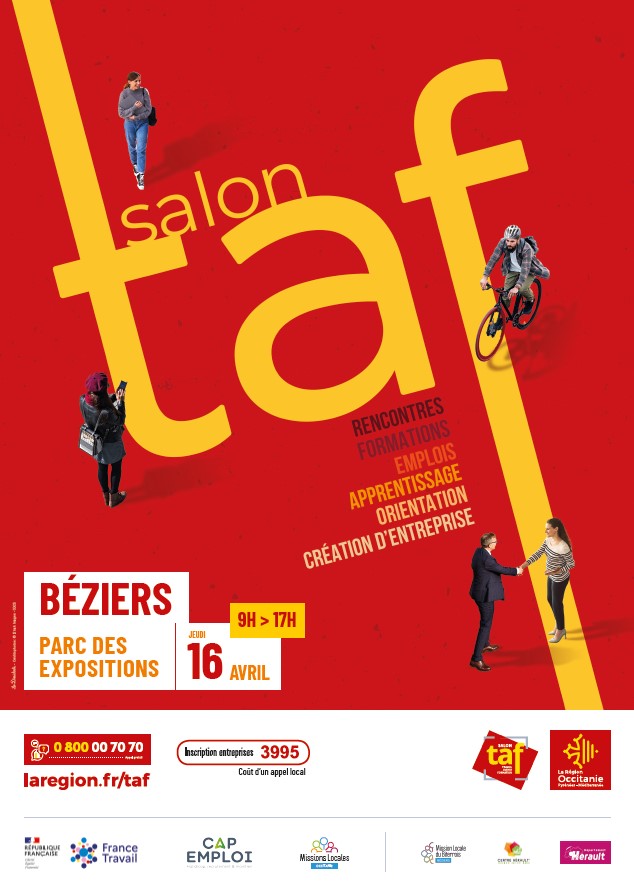 La Région Occitanie organise en partenariat avec France Travail, les Missions Locales, le Département de l’Hérault et le territoire, la quatrième édition du Salon TAF de Béziers qui aura lieu jeudi 16 avril 2026 au Parc des Expositions de Béziers de 9h à 17h.